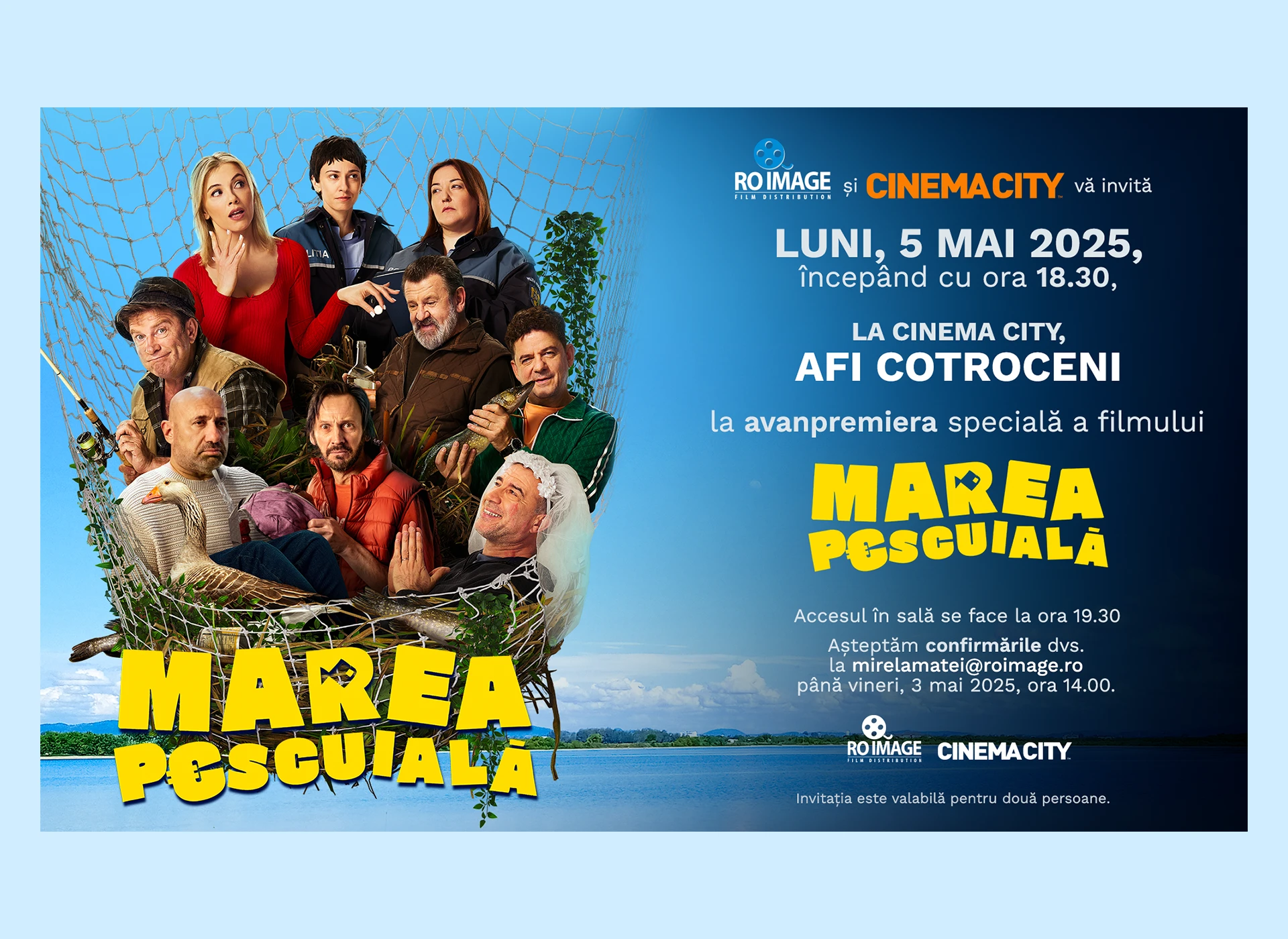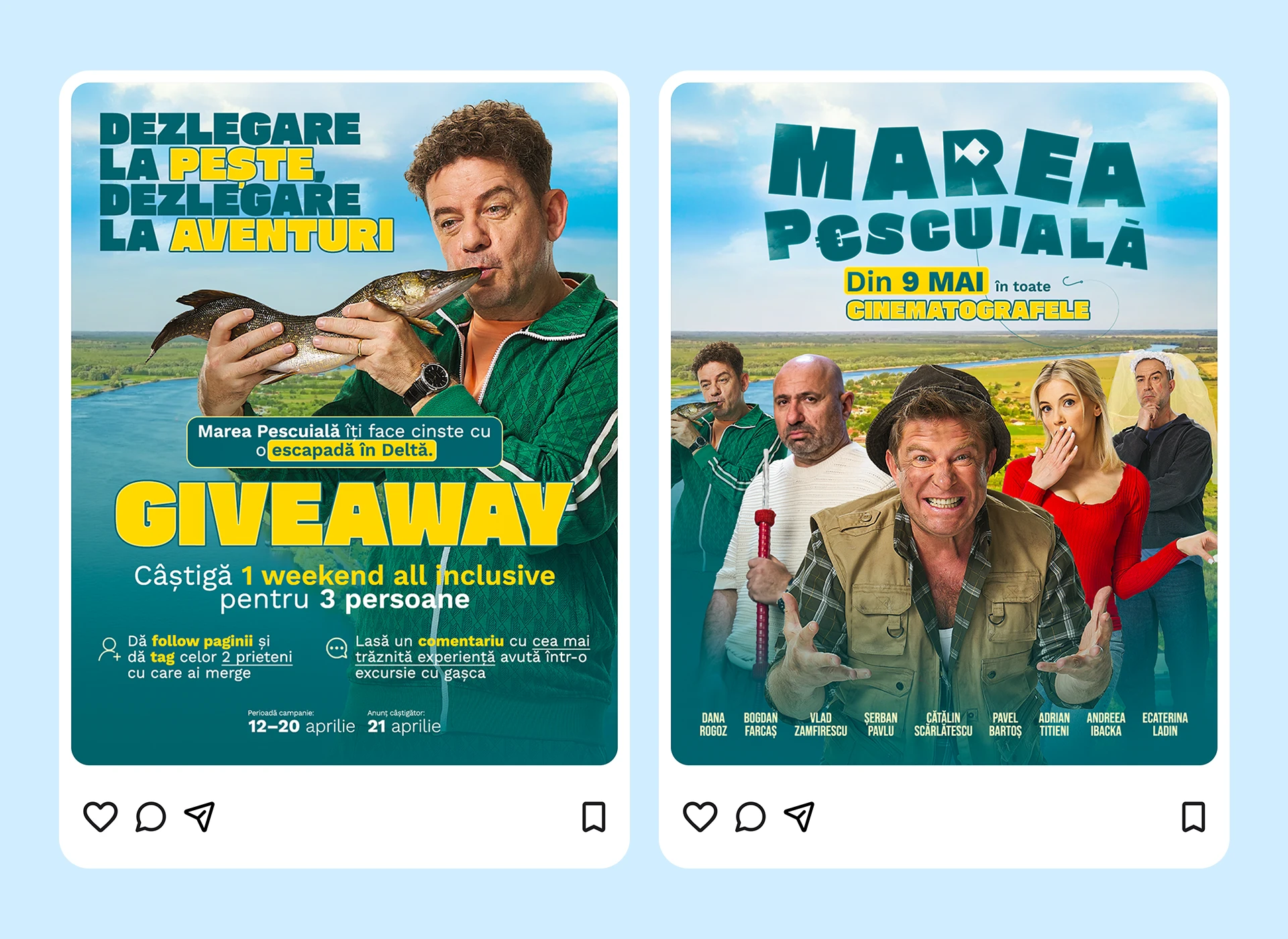 Our creative direction included custom visuals and graphic designs featuring the cast, a hero poster and exclusive behind-the-scenes interviews with the actors, all crafted to capture the film’s humor and personality. The campaign celebrated the essence of Romanian cinema and created a strong, memorable launch for Marea Pescuială.